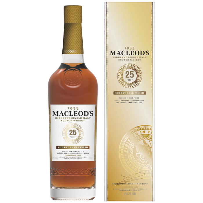 This 25‑Year‑Old single malt opens with inviting aromas of malty sweetness, fresh‑baked cookies, and vanilla custard, layered with fig and raisin. The palate is rich and full‑bodied, revealing seasoned oak, dried cereal grains, and ripe berries, accented by warming cinnamon and dark chocolate. An elegantly spiced finish follows, where syrupy sherry notes linger gracefully, showcasing a sumptuous, multi‑layered whisky whose depth and complexity unfold beautifully with every sip.1933 Macleods