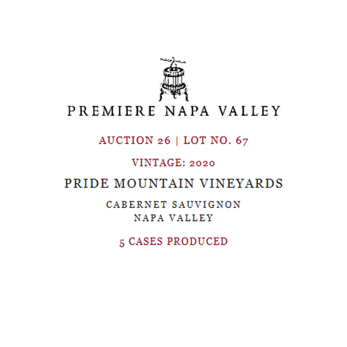 The 2020 vintage was defined by two wildfires: the LNU Complex and the Glass Fire. While these fires resulted in significant losses of grapes for nearly all Napa Valley wineries, some delicious wines were produced from vineyards located far away or harvested prior to the Glass Fire. At Pride Mountain Vineyards, about 60% of our grapes fell into this latter category, and while our production has been dramatically lower than we would like, we are very excited about the quality of the wine. We offer five cases of Cabernet Sauvignon from the vineyard block that we typically use for Premiere Napa Valley, one of the highest elevation blocks in our Rock Arch Vineyard, which we harvested on September 25, two days prior to the Glass Fire. This dense, luscious and expressive wine gives a hint towards what the 2020 vintage should have been, and we are proud to share it.Premier Napa Valley