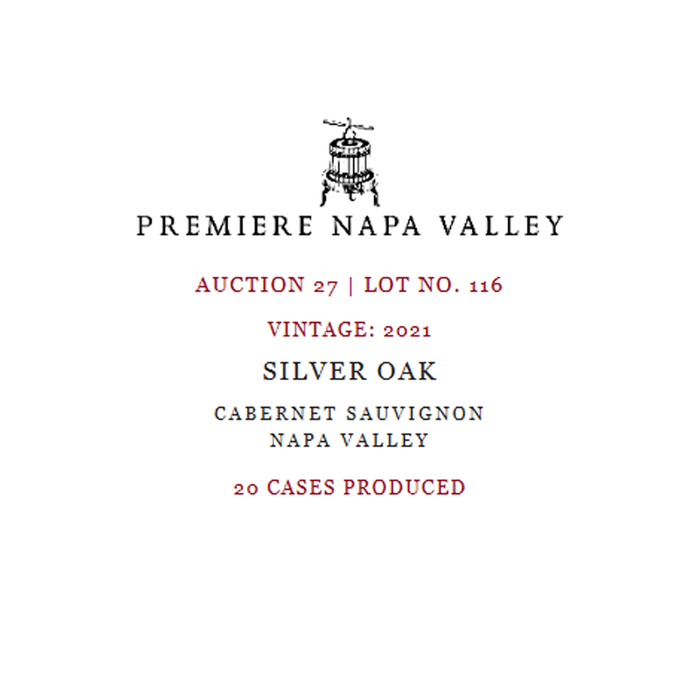 Despite a crop size smaller than normal, the 2021 vintage is noteworthy for its excellent quality. Mother Nature allowed us to craft a blend for Premiere Napa Valley that happened to hark on the Silver Oak heritage of Cabernet Sauvignon. Small berries yielded complex and dense wines with excellent concentration of flavors. This wine has a savory aromatic profile comprised of carnation, licorice and blackberry bramble. Extended aging in American oak adds notes of baking spice and vanilla, while the supporting role of Merlot adds a plush texture across the mid-palate. Refreshing and approachable, your wine has a long finish and will continue to improve through 2050.Premier Napa Valley
