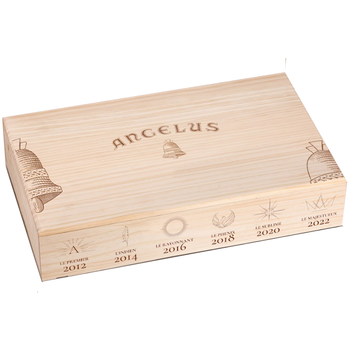 6-Bottle Original Wooden Case which includes one bottle each of the following: 2012 Château Angelus 97JA, 2014 Château Angelus 97WE, 2016 Château Angelus 100JS, 2018 Château Angelus 100JD, 2020 Château Angelus 100TWI, 2022 Château Angelus 100D.