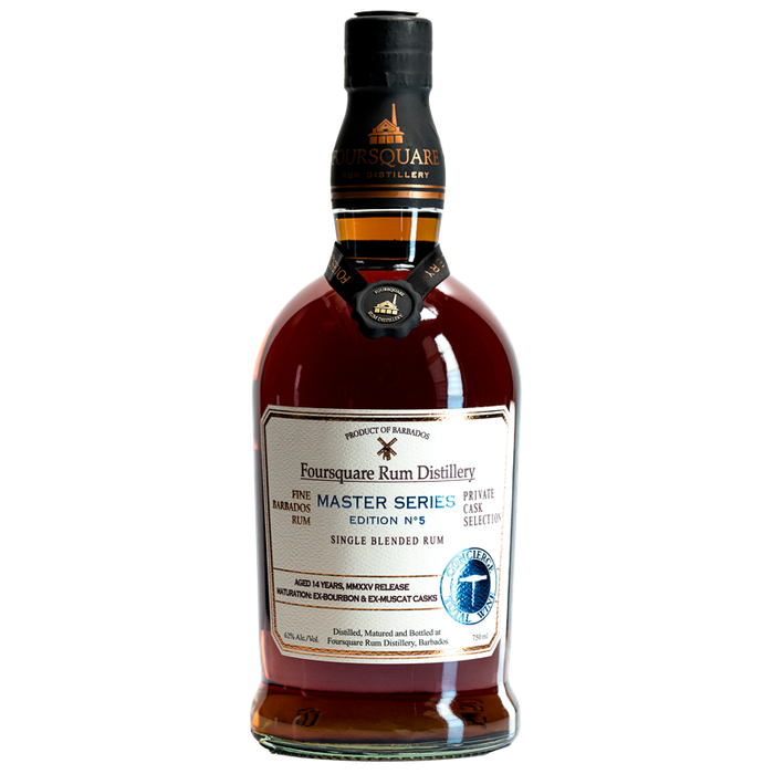 A 14 year double maturation Single Blended Rum, distilled in both the copper double-retort pot still and the continuous twin column coffey still of Foursquare. This release was aged for 9 Years in ex-bourbon barrels, and then transferred into ex-Black Muscat casks for an additional 6 years. Intense, complex and an explosion on the palate, where dark fruits evolve into cocoa, with a bright citrus note at the end surrounded by fresh raspberry and huckleberry. There is a lingering savory note reminiscent of dark roast coffee and dark chocolate. This drinks well under its proof, and is both a great sipper and the star of an unforgettable old fashioned.Foursquare Rum Distillery