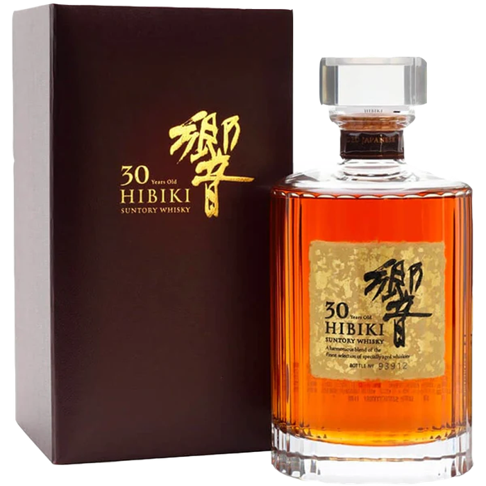 Experience a symphony of maturity in Suntory's Hibiki 30-Year-Old. Deep amber hues give way to a nose of leather and dried fruit, while the palate revels in rich brown sugar, apricot jam, and a whisper of gingerbread. The finish is long, with opulent cinnamon and the distinctive touch of Mizunara oak.Hibiki
