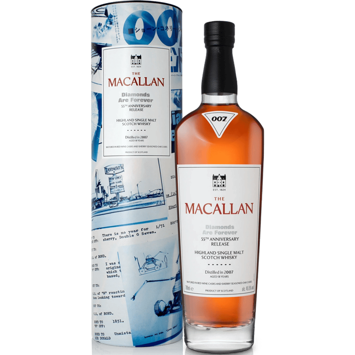 This release celebrates Bond’s connoisseurship of sherry wine through an unexpected selection of sherry and red wine seasoned oak casks, distilled in 2-007.Showing a light Nevada‑rock gold, this whiskey opens with sophisticated notes of polished oak, vanilla bean, and rich dried fruits. The palate is smooth and welcoming, layering creamy vanilla and caramel with cocoa‑dusted champagne truffles, coffee, and dried figs, berries, and apricots. Subtle spices add depth and complexity. The finish is long, refined, and warmly lingering.The Macallan